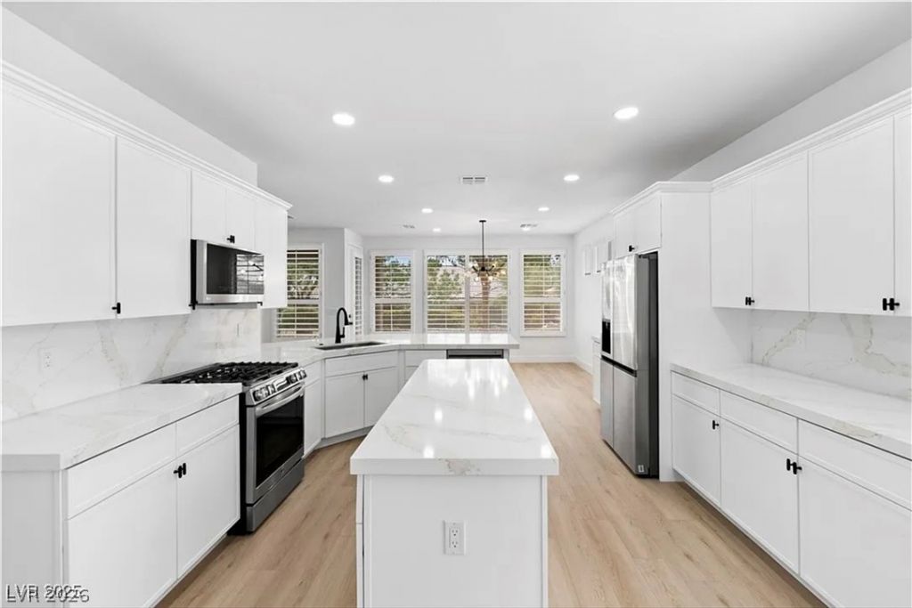 Stunning, completely renovated single-story Summerlin Siena (55+ community) home with new flooring, cabinets, lighting and fresh paint throughout! The stylish large kitchen offers plenty of cabinet space, new quartz countertops and breakfast nook area. The inviting living area showcases a warm ambiance with peaceful surroundings. The primary bedroom offers tranquility and beautiful walk in closet. Indulge in the ultimate relaxation in the large and beautiful primary bath, with custom shower, boasting luxurious finishes, and separate vanities. Step outside to a private paradise offering an ideal setting for outdoor enjoyment. Experience and enjoy the active lifestyle community activities this upscale golf/tennis/pickleball community offers along with the unlimited other recreational and social activities. Easy access to the 215 and close to Downtown Summerlin shops and restaurants.