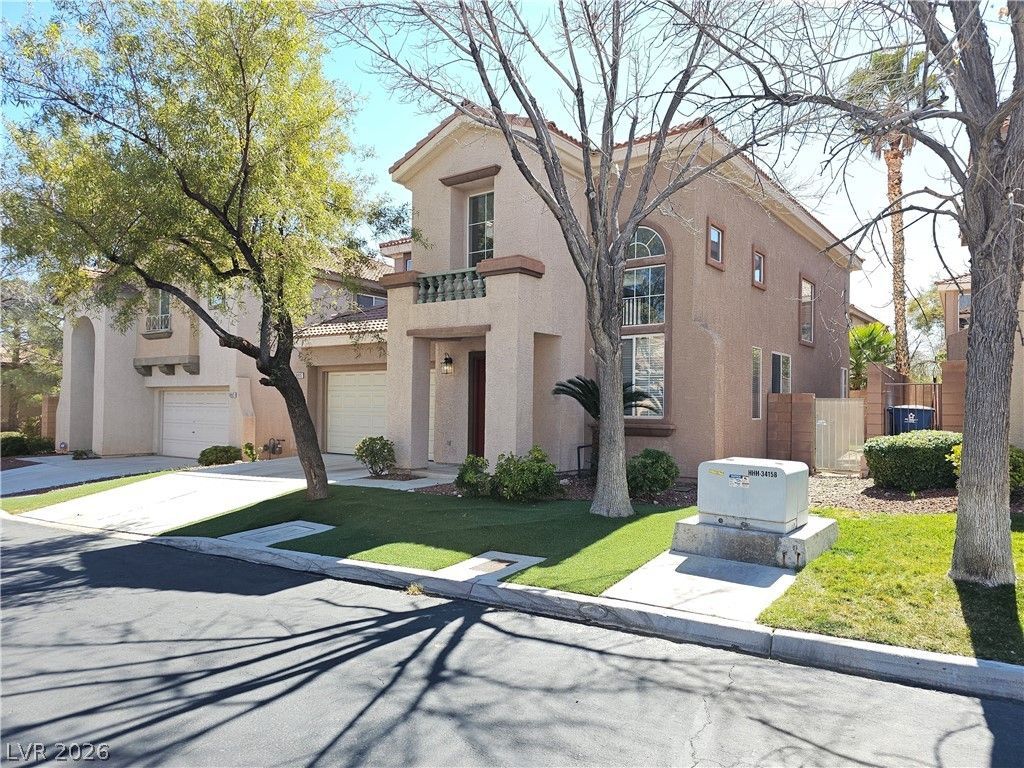 DON'T MISS THIS GORGEOUS TWO-STORY HOME IN GATED SUMMERLIN COMMUNITY! HARD SURFACE FLOORING THROUGHOUT DOWNSTAIRS. KITCHEN FEATURES STAINLESS APPLIANCES, ISLAND, WHITE CABINETRY, WINE FRIDGE AND GRANITE COUNTERS OVERLOOKING FAMILY ROOM. CATHEDRAL CEILING IN LIVING ROOM SEPARATE FROM FAMILY ROOM. FAMILY ROOM HAS CEILING FAN AND MEDIA NICHE. TWO BEDROOMS UPSTAIRS. GUEST BATHROOM UPSTAIRS HAS GOOD COUNTER SPACE. PRIMARY BEDROOM HAS WALK IN CLOSET AND CEILING FAN. PRIMARY BATHROOM COMES WITH SEPARATE TUB AND SHOWER, DOUBLE SINKS AND VANITY AND TOILET CLOSET. LOW MAINTENANCE BACKYARD WITH COVERED PATIO AND ARTIFICIAL TURF. NEAR TO THE RED ROCK CANYON ENTRANCE, RED ROCK CASINO, DOWNTOWN SUMMERLIN, AND MUCH MORE! TENANT TO VERIFY ALL INFORMATION INCLUDING SCHOOLS.