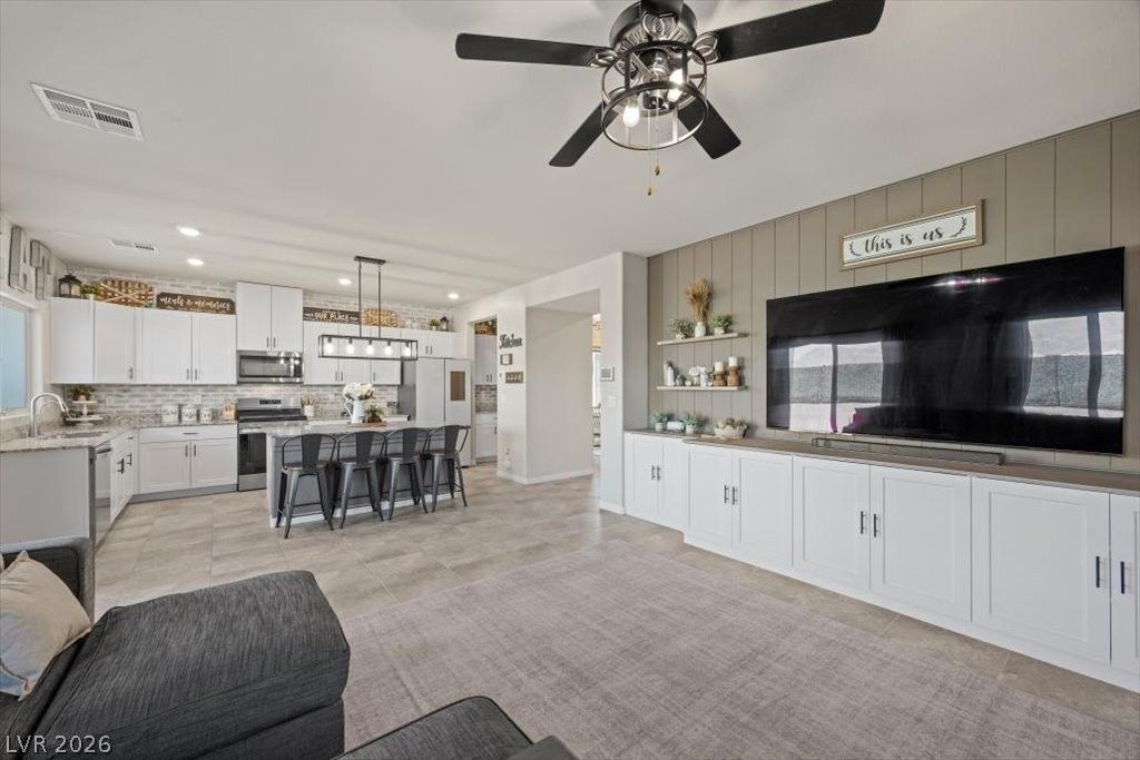Built in 2022 by D.R. Horton, this beautifully upgraded 5-bedroom, 3-bath home blends modern design with thoughtful custom touches. Located in the gated Sonora Ranch community near Craig Ranch Regional Park, the home features an open-concept kitchen and living area with white cabinetry, limewashed brick backsplash, and custom built-ins creating a seamless entertainment wall. A striking black shiplap entry and stylish beadboard and board-and-batten accents add character throughout. The flexible layout includes a bedroom and full bath downstairs, while upstairs the loft has been transformed into a private movie theater with projector and screen included. The backyard is a true retreat with a sparkling pool, low-maintenance turf, mountain views, and no rear neighbors. Complete with a 3-car garage and convenient access to I-15, Nellis AFB, schools, shopping, dining, and parks. Move-in ready!