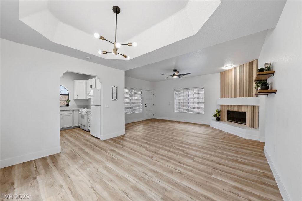 Fully renovated and move-in ready condo featuring quartz countertops, luxury vinyl plank flooring throughout, 5-inch baseboards, new kitchen cabinetry, and updated lighting. The living area is highlighted by a custom vertical-slat accent fireplace wall, while both bathrooms with new vanities, upgraded showers, and modern fixtures. AC unit and water heater are both less than 2 years old.