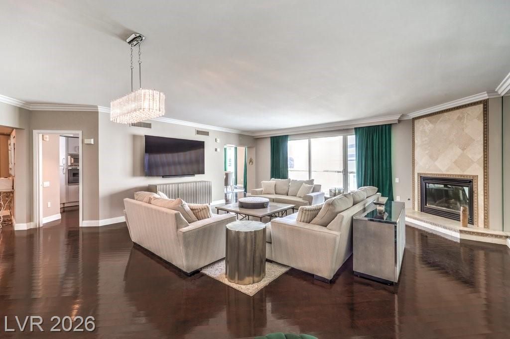 Three Turnberry Place is an ultra-luxury tower featuring a sophisticated lifestyle with dedicated pool, gym, and a friendly staff ready to assist you. Just off the Las Vegas Strip this location provides world class entertainment, dining, shopping, and sports venues. Stunning E unit features spectacular views of the Sphere, Strat, city lights, Stirling Club, and mountains. Kitchen treated with sleek white cabinetry, granite, wine cooler, Gaggenau cooking appliances, and Sub-Zero refrigerator. Primary suite offers a restful retreat highlighted by a terrace and a spa bath complete with jetted tub, walk-in shower, bidet, and a Toto toilet. Upgrades consist of hardwood, marble, pattern carpet, crown molding, 2-tone paint, stylish fixtures, solid doors, fireplace, and floor to ceiling windows, plus much more. You will fall in love with the optional Stirling Club membership with access to a restaurant, bar, fitness center, resort spa, pool, tennis, pickle ball, and exciting social calendar.