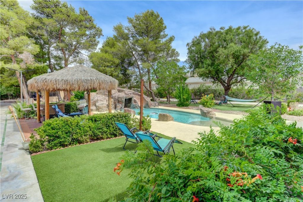 Motivated seller. No HOA! $266 per square foot!! This one-of-a-kind entertainment home sits on a .86-acre horse-zoned lot with RV parking, privacy, and mature landscaping. The main home offers 4 bedrooms, 3 baths, and 4,164 sq ft of open living space with a bright kitchen, granite counters, stainless appliances, and a spacious primary suite. The backyard is a resort-style oasis with heated pool, spa, rock grotto, waterslide, and covered patio with misters. A detached 1,272 sq ft guest house includes 2 bedrooms, 2 baths, full kitchen, and laundry ideal for guests or rental income. Centrally located near Desert Inn and Jones, close to shopping, dining, and the Strip. A rare opportunity!!