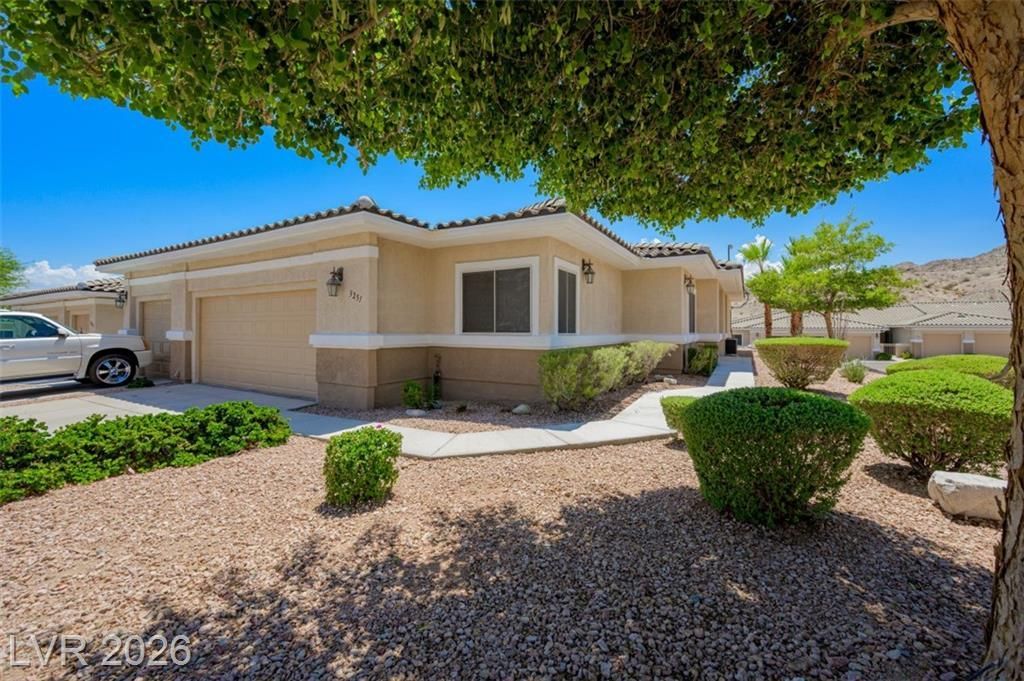 Discover your dream home in this beautifully maintained 3-bedroom, 2-bath single-story end unit! Welcoming entryway leading to an expansive great room filled with natural light, cozy gas fireplace, and media niche. The spacious island kitchen features ample cabinets and prep space along with casual dining. Generous owner's suite, complete with private patio access, dual closets, and sinks, as well as separate tub and walk-in shower. Two additional bedrooms with mirrored closet doors, a full guest bath, and a convenient laundry room with a utility sink add to the home's appeal. Direct access to the attached garage makes life even easier. Step outside to your extended covered patio, where you can soak in breathtaking mountain views and enjoy stunning sunsets during relaxing evenings. This home also boasts a full 2-car driveway. Conveniently located near open parking and mail boxes in Quail Ridge, a gated community with heated pool, hot tub, clubhouse, horseshoe pit, and putting green.