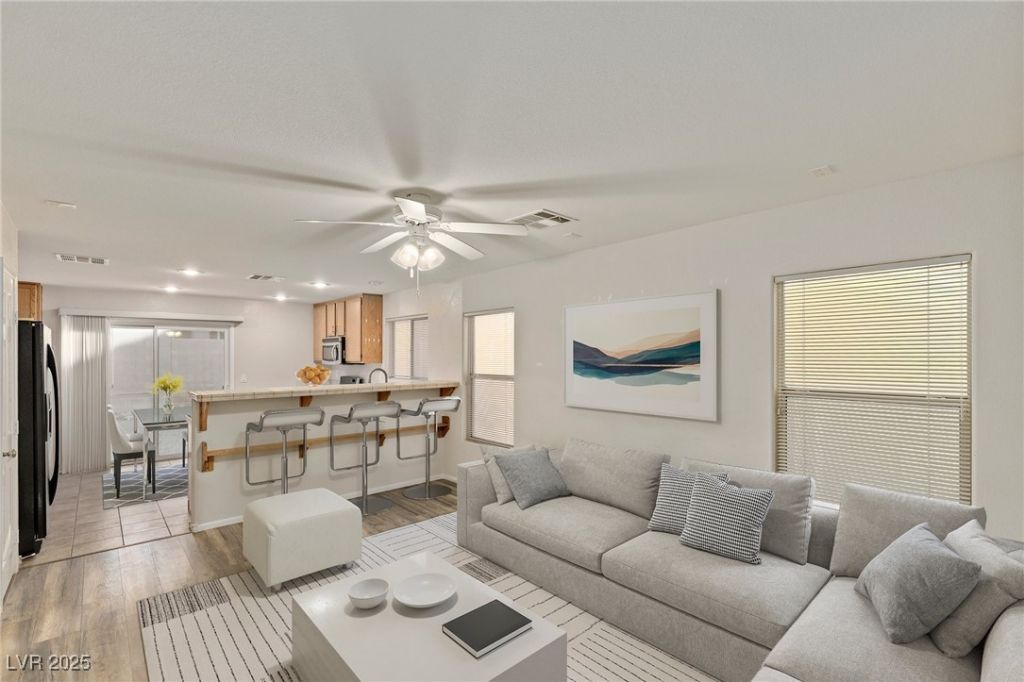 Welcome to 445 Royal Bridge, a charming 2-story home situated in Las Vegas's serene Huntington Village. This 1,297-square-foot property features 2 spacious bedrooms & two and a half bathrooms. The primary suite offers a private retreat w/ dual sinks, a soaking tub, & a separate shower, while the second bedroom includes its own balcony?perfect for enjoying quiet moments. An upstairs loft provides flexible space for a home office, play area, or reading nook. The kitchen is thoughtfully designed w/ stainless steel stove & dishwasher, a breakfast bar, & pantry. A dedicated upstairs laundry room adds convenience w/ built-in cabinetry. The backyard awaits your personal touch, offering a blank canvas for gardening, entertainment, or relaxation. Additional highlights include a garage with storage & workbench, nearby guest parking, & easy access to walking trails, shopping, schools, & freeway connections. This home blends comfort, practicality, & location into a truly inviting package.