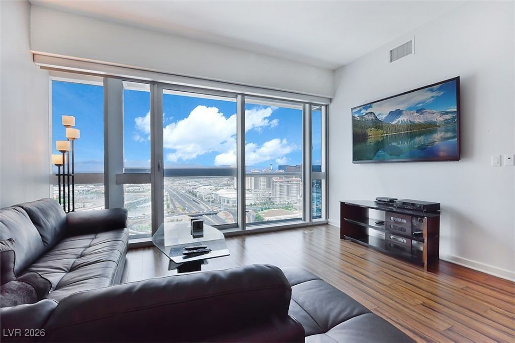 Perched high above the Las Vegas skyline, this elegant 2bd/2ba residence delivers elevated high-rise living with breathtaking views of the Strip and surrounding cityscape. The spacious open-concept layout is enhanced by floor-to-ceiling windows that flood the home with natural light, showcasing sleek modern finishes, contemporary cabinetry, and refined design throughout. The well-appointed kitchen flows seamlessly into the living and dining areas, ideal for entertaining or unwinding while enjoying the views. Residents enjoy access to resort-style amenities including a resort pool, fitness center, concierge services, and 24-hour security, all just moments from world-class dining, entertainment, and the energy of the Las Vegas Strip.