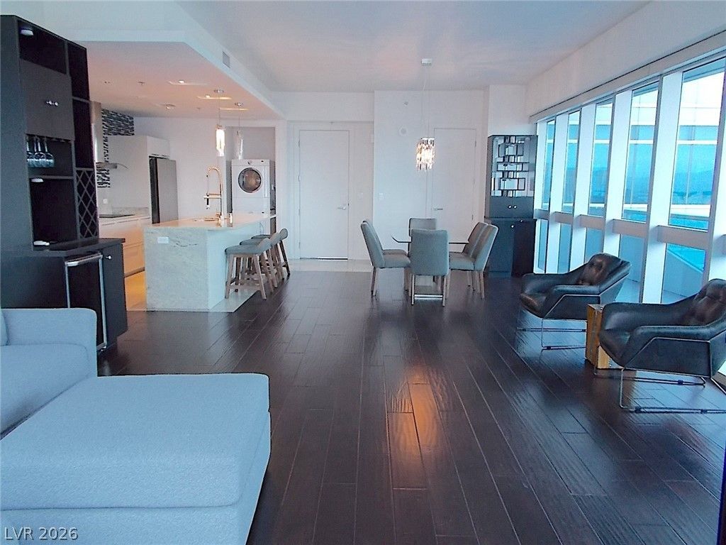 This stunning unit features an open-concept living area with dramatic floor-to-ceiling windows and a private balcony showcasing breathtaking views of the Las Vegas Strip. The modern kitchen is appointed with stainless steel appliances, stone countertops with full backsplash, sleek contemporary cabinetry, tile flooring, and a spacious island accented by recessed lighting and two elegant glass pendant fixtures. A conveniently located stackable washer and dryer are tucked neatly into a kitchen-adjacent nook for added ease. Bedroom one offers floor-to-ceiling windows, a queen-sized bed, and a mounted television. The connected hall bathroom features tile flooring, recessed lighting, and a glass-enclosed tile shower with Strip views. The primary suite includes plush carpeting, a queen-sized bed, and television. The en-suite bath is designed with double sinks and a walk-in shower. Enjoy luxury high-rise living just steps from the heart of the Strip, with world-class dining and entertainment.