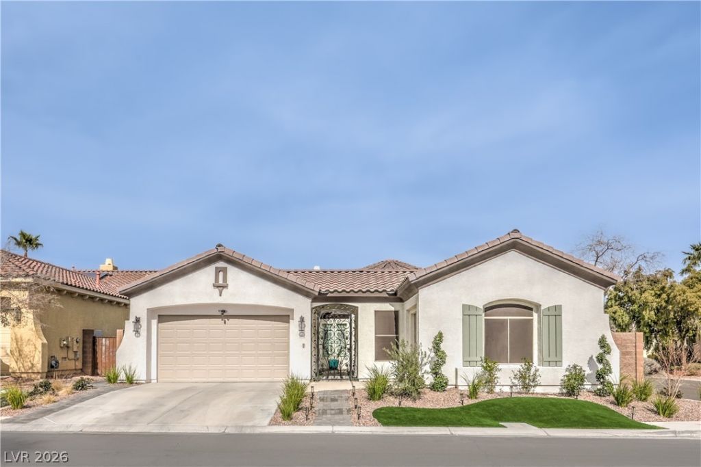 Exquisite 4BR/3BA single-story home in Southern Highlands featuring an upscale, timeless renovation. Contemporary interior design, open floor plan, 10' ceilings, refined finishes, and easy access to resort-style backyard?convey the sense of a relaxing vacation. The home's corner-lot setting surrounded by single-story homes provides exceptional privacy. Its on-trend recently-painted exterior palette, Spanish architectural details, turret, and decorative iron gate provide distinctive curb appeal. All of the main elements have been recently updated: kitchen, bathrooms, entertainment spaces, appliances, LVP flooring, tankless water heater, soft water system, paid-off solar, HVAC system, custom shutters, and custom landscaping. Plus, a stylish new pool and spa?with an integrated sun shelf and smart controls via cellphone app?enhance the home's easy-living feel. 3-car garage prewired for EV. Convenient location to nearby shopping, LV Strip, airport, and freeways. Close-in LV location to CA.
