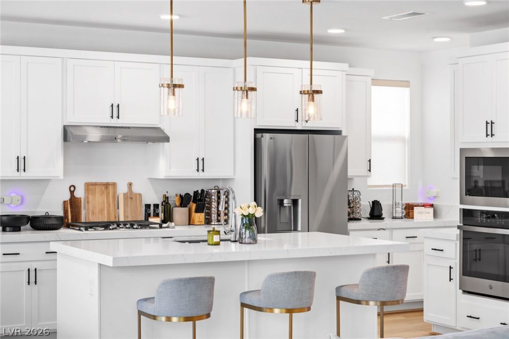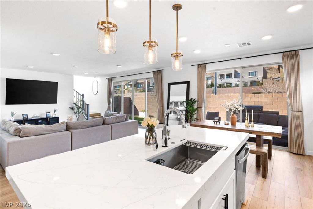 Better than new, this stunning Tri Pointe home, built less than two years ago, delivers the quality of new construction without the wait, offering a thoughtfully designed open-concept floorplan that radiates both charm and curb appeal. Inside, luxury vinyl plank flooring flows seamlessly throughout, anchoring a modern, cohesive aesthetic. The heart of the home is a show stopping kitchen featuring quartz countertops, an oversized island, brushed gold pendant lighting, & premium finishes. Dual set of sliding glass doors flood the main living space with natural light to the fully landscaped backyard. With 3 bedrooms & generously sized secondary bedrooms, the layout offers flexible living. The expansive primary suite serves as a private retreat, complete with a spa-inspired bathroom. Ideally situated near Bishop Gorman High School, top-rated dining, shopping, parks, and everyday conveniences, this immaculate home is the perfect blend of style, functionality, & Las Vegas living at its best.