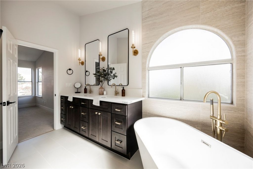 Experience modern elegance & understated luxury in the heart of Green Valley. This humble residence has received a comprehensive update starting with a welcoming exterior adorned by tasteful desert xeriscape. Awaiting inside you'll discover a space augmented by soaring ceilings & a tranquil palette beautifully accentuated by a elegant fixtures & a classy iron banister system. Craft chef inspired cuisine in a gourmet kitchen lined with rich wood soft close cabinets, quartz countertops a massive center island, & professional appliances. Getaway & serenity rules in a primary suite decorated in spa worthy textiles & finishes. The palatial dual vanity paired with sconces and oversized mirrors impress immediately while the soaking tub & shower lined with floor to ceiling tile offer the perfect space to wash away the worries of your day. Entertain in style outback with wall-to-wall artificial grass, a cozy firepit, & a casual pergola under a foundation of pavers. Schedule your tour today!