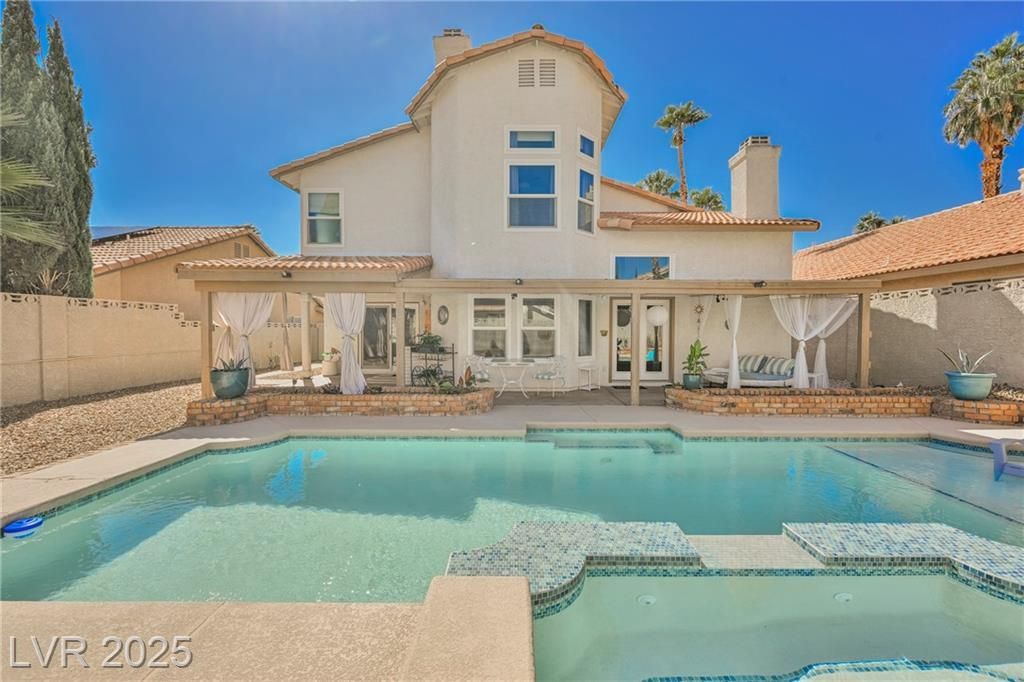 Welcome to Desert Shores, Las Vegas! Affordable Luxury in a timeless, resort like community. This turnkey home is perfectly set up for multi-generational living, featuring an essential downstairs bedroom & 3/4 bath with walk in shower. This home boasts custom modernized bathrooms & designer kitchen with high-end appliances. Enjoy an expansive downstairs flex space & an upstairs loft. Resort-style backyard has an outdoor kitchen & a completely upgraded pool with a sun bench, and state-of-the-art Pentair pool system. Significant structural updates include a new HVAC system & all new windows. There is smart technology throughout. Curb appeal is maximized with a significant amount invested into landscaping, new gates, & a coveted real grass lawn. The location is unparalleled: you are less than 1 mile to shopping, 5 star dining, & lakeside walking trails right in the heart of Desert Shores - such as Lake Maddison & Lagoon Pool/Park. This is modern, maintenance-free luxury at it's best!